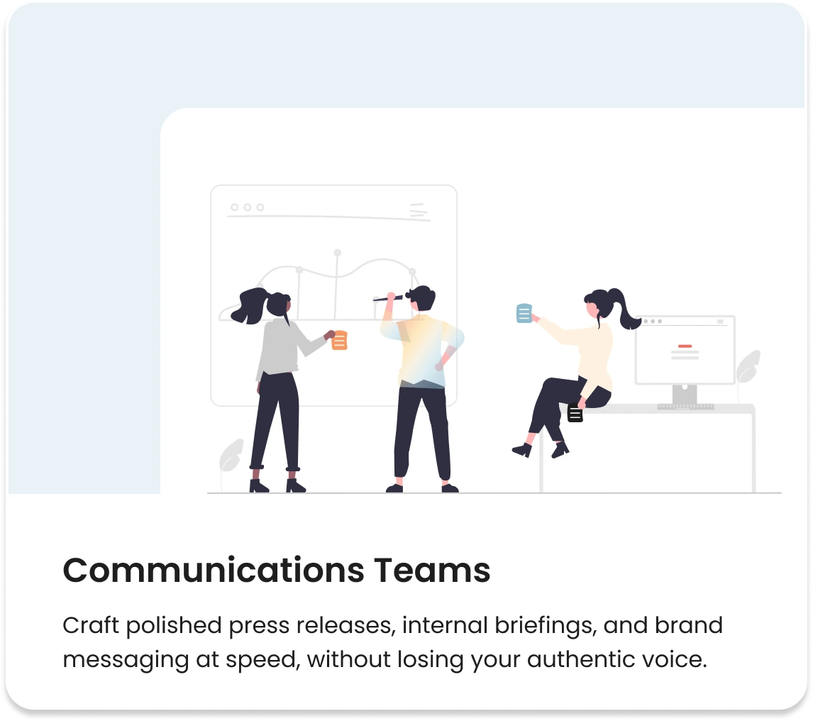 Craft press releases, internal briefings, and comms strategies in minutes — not hours. albie helps you move faster, stay on-message, and elevate every word.